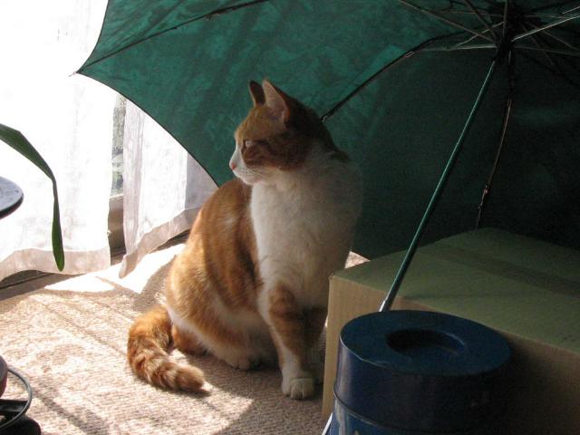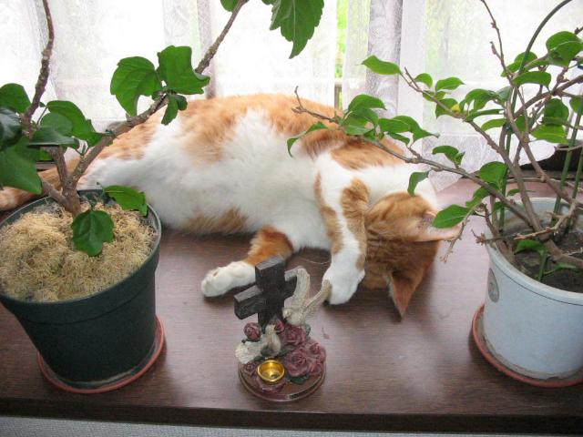 出窓でくつろぐアブとミケ。寝るのはかまわんが、植木鉢を落とすな!!(2度ほどやられた)